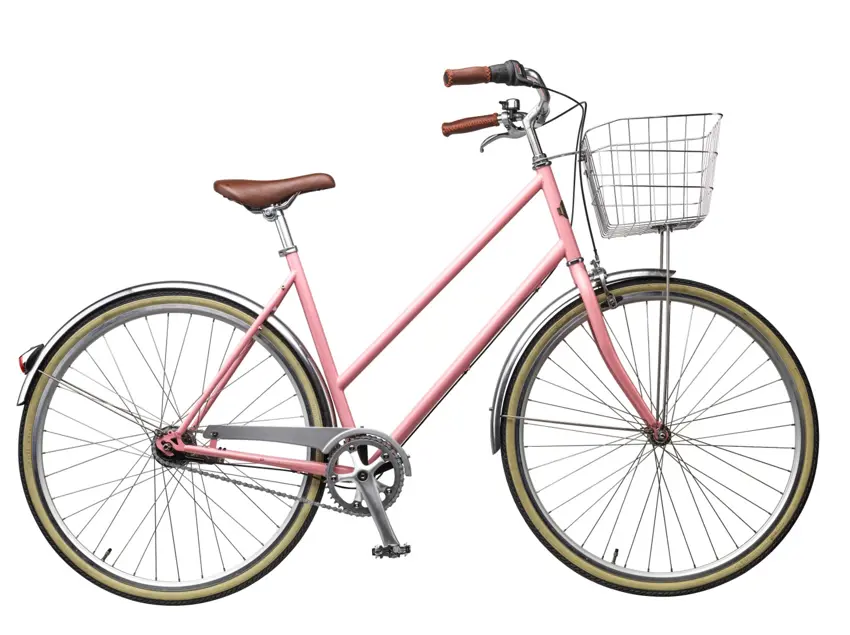 Det enkle, slanke stel, de tynde dæk med hvid kant samt sadel og greb i læderlook giver cyklen et let og elegant udtryk, der vil pynte på cykelstien. Den diskrete trådkurv er prikken over i'et.